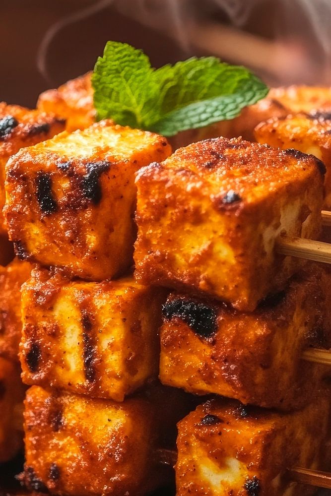 Aromatische Dämpfe steigen auf und umhüllen perfekt gegrillte, goldene Tofuwürfel, die kunstvoll auf Spießen arrangiert sind. Saftige Kräuter und eine rustikale Holzoberfläche verleihen dem Bild eine einladende Wärme. Ideal für die Küche, weckt es Appetit und inspiriert zu kreativen Kochabenteuern. Ein perfekter Blickfang für alle Feinschmecker!