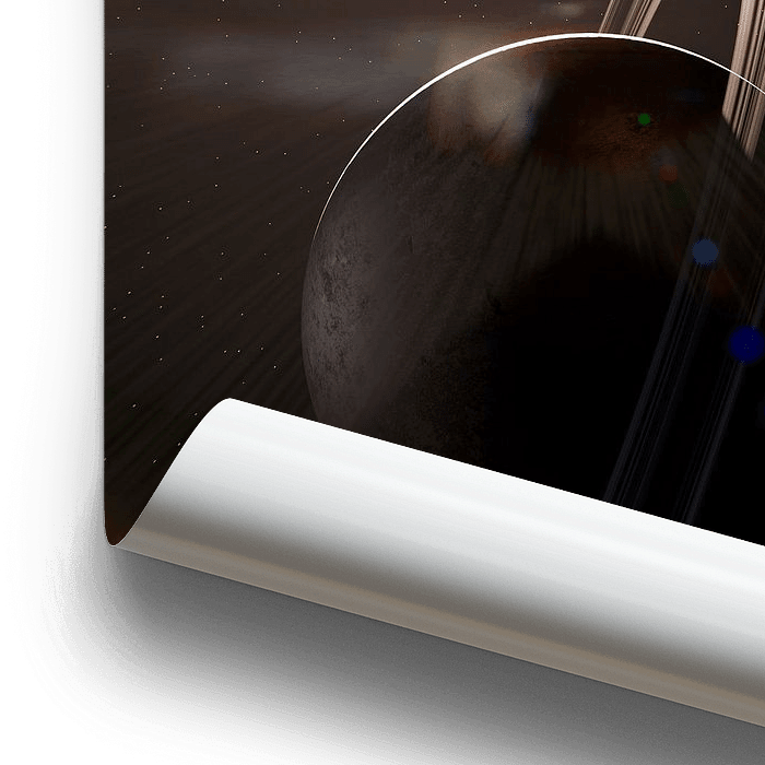 Ein Sci-Fi-Bild eines Fantasie-Planeten mit Planetenringen und einem nahen Mond. Viele optische Störungen.