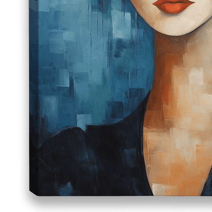 Reflexion - Dieses Porträt wird von der unverwechselbaren Ausdruckskraft der Augen der Frau dominiert, die sich von einer abstrakten Komposition aus kühlen Blautönen im Hintergrund abheben. Der stilisierte Hut und das rötlich-braune Haar bieten einen warmen Kontrast, während die klaren, fast grafischen Formen einen modernen und doch…