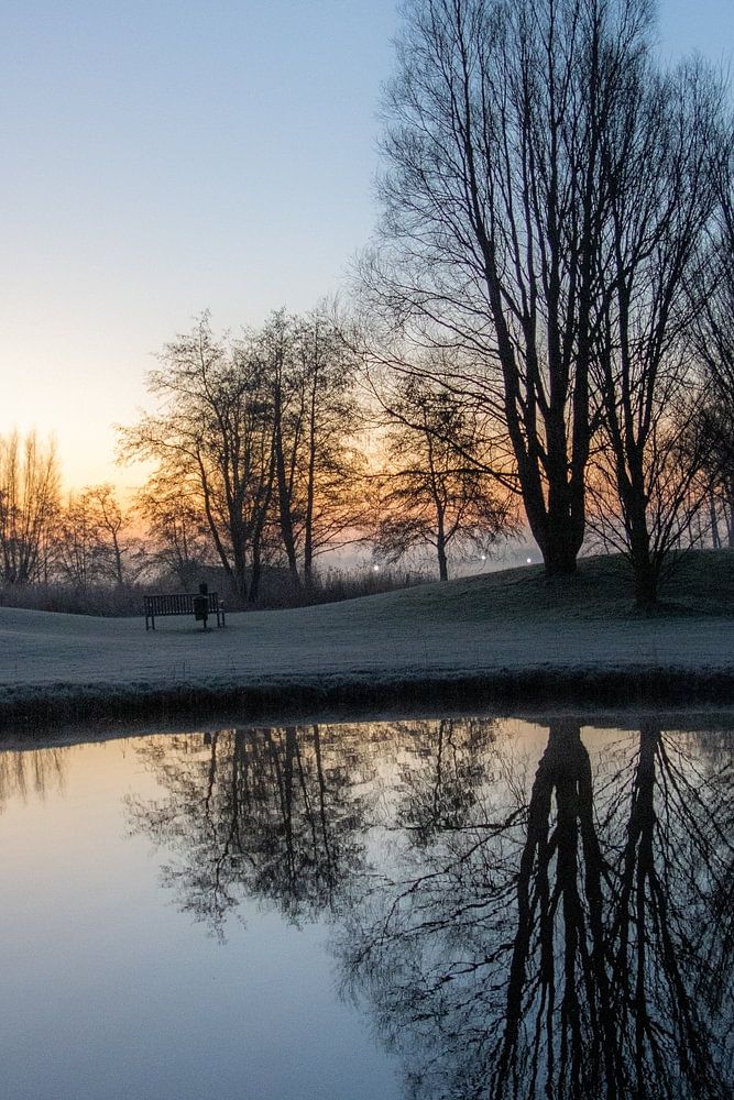 Bäume spiegeln sich in einem Pfund Wasser im Rozenstein Washington Golf Club mit Morgenlicht im Hintergrund.