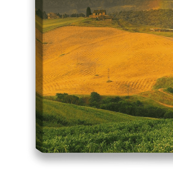 Bestelle dieses Landschafts-Wandbild Regenbogen über Pienza, Toskana, Italien von Henk Meijer Photography als Reproduktion auf Leinwand, Alu-Dibond, als Poster, Fototapete oder Acrylglasbild.