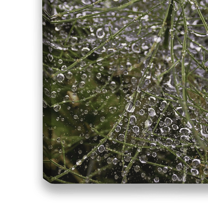 Bestelle dieses Blumen-Wandbild Regentropfen auf Spinnennetz - Zinnkraut von Christine Nöhmeier als Reproduktion auf Leinwand, Alu-Dibond, als Poster, Fototapete oder Acrylglasbild.