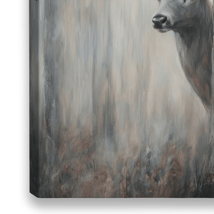 In einem geheimnisvollen Wald, durchzogen von sanftem Nebel, lugt ein neugieriger Hirsch hinter einem mächtigen Baum hervor. Seine stolzen, verzweigten Geweihe zeichnen sich elegant gegen den grauen Hintergrund ab, während seine großen, wissenden Augen den Betrachter beobachten. Die Stille des Waldes umhüllt die Szene und verstärkt das…