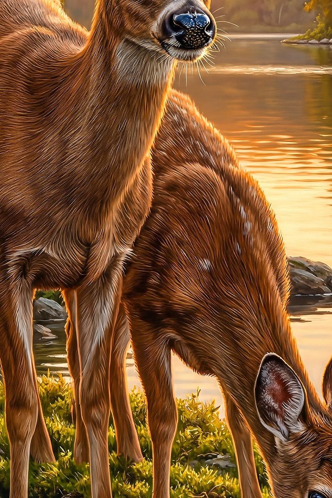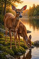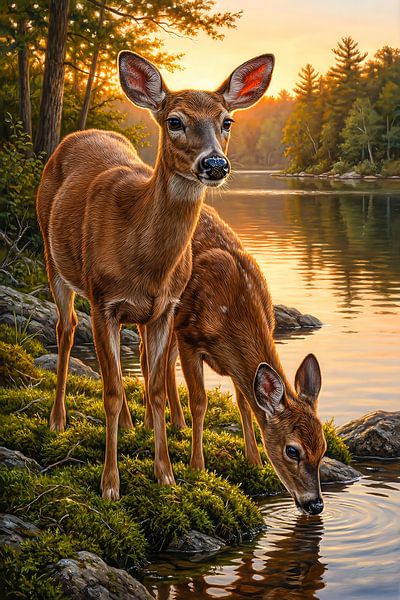 Bringen Sie die Ruhe der Natur in Ihr Zuhause. Dieses stimmungsvolle Motiv zweier Rehe bei Sonnenuntergang am Seeufer fängt den magischen Moment der goldenen Stunde perfekt ein.