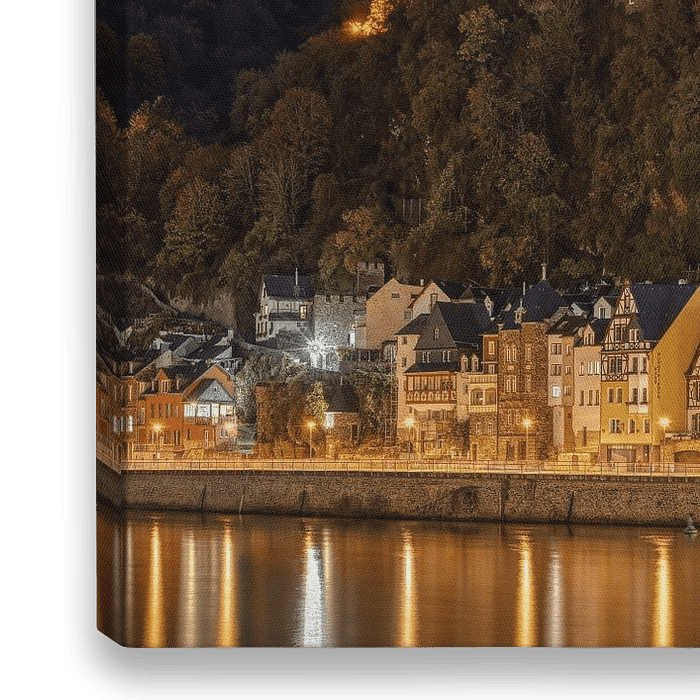 Blick vom Moselufer zur Reichsburg Cochem, die nach Sonnenuntergang beleuchtet wird.