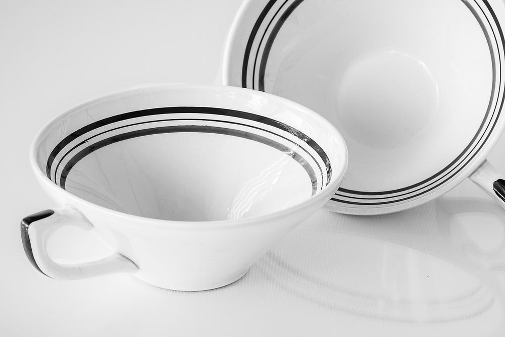 Die Abwesenheit von Farbe und die Verwendung von nur weißen und grauen Tönen betonen die Formen des Geschirrs. Auch aufgrund des weichen Lichts und der geringen Kontraste vermittelt dieses Bild Ruhe, Raum und Sauberkeit.