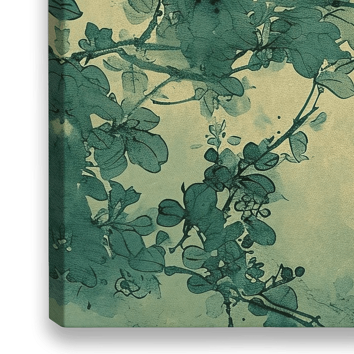 Peace - Dieses Gemälde zeigt einen friedlichen Vogel auf einem Zweig, der in einem monochromen, blaugrünen Farbton gehalten ist, der einen rustikalen Charme versprüht und an eine klassische orientalische Tuschezeichnung erinnert. Die subtile Textur im Hintergrund verleiht dem Bild eine antike Anmutung und macht es perfekt für ein…