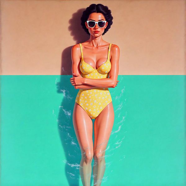 Bestelle dieses Blumen-Wandbild Retro-Frau im gelben Badeanzug von Jan Keteleer als Reproduktion auf Leinwand, Alu-Dibond, als Poster, Fototapete oder Acrylglasbild.
