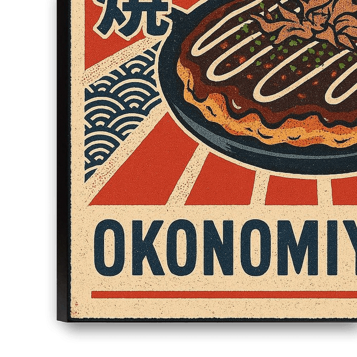 Dieses Okonomiyaki-Poster fängt den Geist des berühmten herzhaften Pfannkuchens aus Osaka in einem gewagten Retro-Design ein. Illustriert mit dynamischen aufgehenden Sonnenstrahlen, Toppings und authentischen japanischen Schriftzeichen, feiert das Kunstwerk eines der gemütlichsten Straßenessen Japans. Die Vintage-Textur und das begrenzte Farbschema verleihen dem Kunstwerk einen nostalgischen Reiz, perfekt für Liebhaber der japanischen Küche und Kultur. Ganz gleich, ob Sie Okonomiyaki schon auf einem Nachtmarkt in Osaka genossen haben oder es zum ersten Mal probieren, dieser Druck erweckt die köstliche Erfahrung zum Leben. Ideal für Küchen, Essbereiche oder japanische Restaurants, verleiht es jedem Raum Wärme, Stil und kulturelles Flair. Diese japanische Essenskunst ist auch ein sinnvolles Geschenk für Feinschmecker, Reisende oder alle, die sich für die japanische Straßenkultur begeistern. Das lebendige Design und die authentischen Details machen es zu mehr als nur Wandkunst - es ist eine Kostprobe des kulinarischen Erbes Japans, eingefangen in einem zeitlosen Pop-Art-Stil.