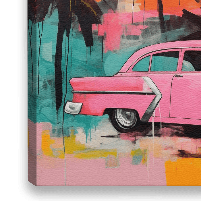 Dieses farbenfrohe Gemälde mit einem Oldtimer vor einem lebhaften Hintergrund, der an ein tropisches Paradies erinnert, versetzt Sie in eine andere Zeit. Die leuchtenden Orange- und Rosatöne spiegeln die Wärme und Unbeschwertheit eines sommerlichen Sonnenuntergangs wider, während die Silhouetten der Palmen ein entspanntes Urlaubsgefühl…