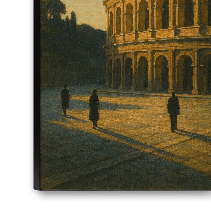 Hoppers Colosseum Glow fängt die Erhabenheit von Roms ikonischstem Monument ein, wie es im Sonnenlicht des späten Nachmittags steht. Die über Jahrhunderte gemeißelten Gewölbe strahlen in einem sanften Bernsteinton, während sich lange menschliche Schatten über den antiken Platz erstrecken. In dieser ruhigen, monumentalen Stille kanalisiert der Künstler Edward Hoppers Faszination für Größe, Einsamkeit und Licht als Emotion.