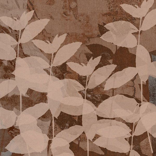 Bestelle dieses abstrakte Wandbild Romantische Blätter. Wabi-sabi botanisch abstrakt. Blätter in braunen Farben von Dina Dankers als Reproduktion auf Leinwand, Alu-Dibond, als Poster, Fototapete oder Acrylglasbild.