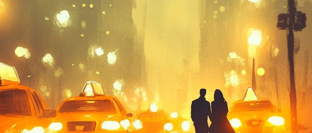 In einem zauberhaften Spiel aus Licht und Schatten entfaltet sich eine romantische Szene, in der sich zwei Silhouetten vor glühenden Taxis in der regennassen Stadt umarmen. Die warmen gelben Lichtpunkte verleihen dem Moment eine nostalgische Note. Dieses Kunstwerk bringt eine behagliche Atmosphäre ins Wohnzimmer und lädt zum Träumen ein.
