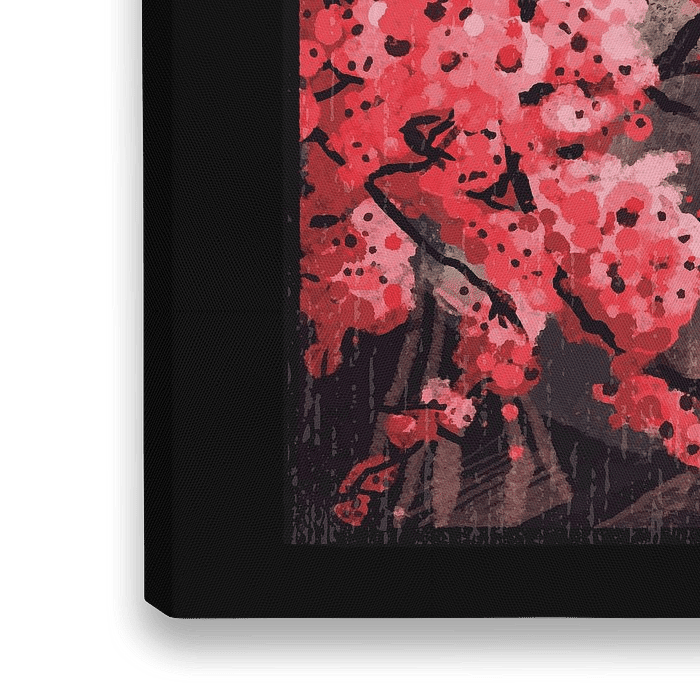 Malerei/ Kunst: Rosa Rote Blüten eines Baums im Frühling vor dem roten Sonnenuntergang hinter den schwarzen Bergen