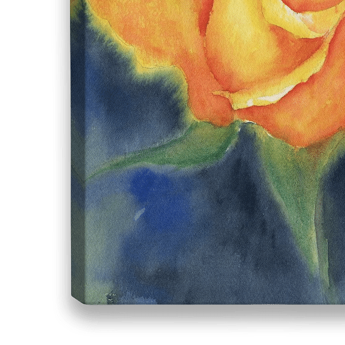 Eine leuchtend orange Rose erblüht vor einem tiefblauen Hintergrund. Die zarten Blütenblätter sind von grünen Blättern eingerahmt. Das warme leuchtende Orange der Blüte wird durch den Kontrast zu den kühlen dunkleren Hintergrundfarben in Blau- und Grünschattierungen betont. Die subtile Farbmischung unterstreicht die natürliche Schönheit der Blütenblätter.