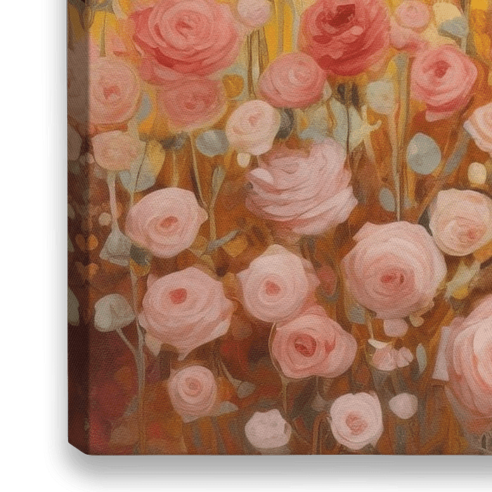 "Roses on Gold" ist ein digitales Gemälde von rosa und roten Rosen in der Blüte auf einem goldenen Hintergrund. Die Arbeit gibt einen warmen eleganten Blick auf Ihr Interieur!