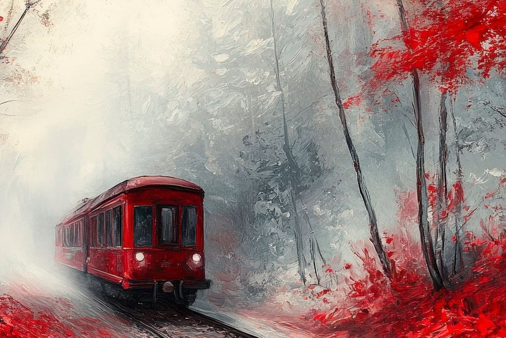 Ein roter Zug schneidet durch eine neblige, herbstlich gefärbte Waldlandschaft, umgeben von leuchtend roten und goldenen Blättern. Die mystische Atmosphäre und der Kontrast zwischen den warmen Farben und dem geheimnisvollen Nebel verleihen diesem Kunstwerk eine gefühlvolle Tiefe, perfekt für ein gemütliches Wohnzimmer, das zum Träumen einlädt.