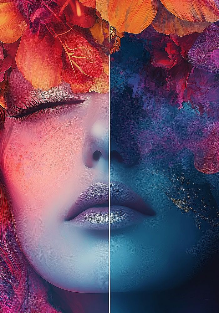 Die Blumen in ihrem Haar dienen als verbindendes Element zwischen den beiden Hälften und stellen die natürliche Schönheit und Zerbrechlichkeit des Lebens dar. Sie stehen für das Gefühl der Kontinuität und Verbindung zwischen den kontrastierenden Farben.