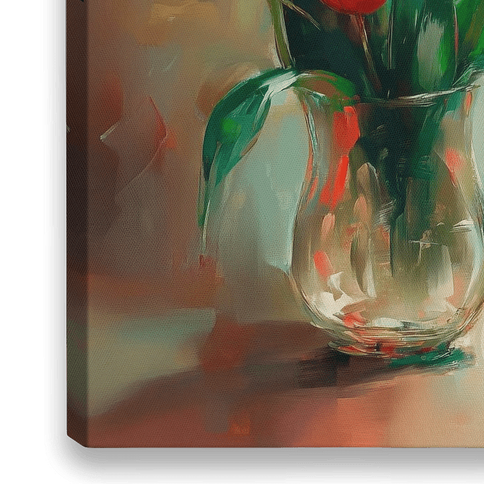 Im sanften Licht strahlen leuchtend rote Tulpen förmlich vor Vitalität. Ihre geschwungenen Blütenblätter und kräftigen grünen Stängel verleihen dem Arrangement eine fröhliche Eleganz. Das zarte Glanzspiel des Glases reflektiert die Farbenpracht und zaubert eine Atmosphäre voller Lebensfreude und Frühlingserwachen. Ein stilles Fest der…