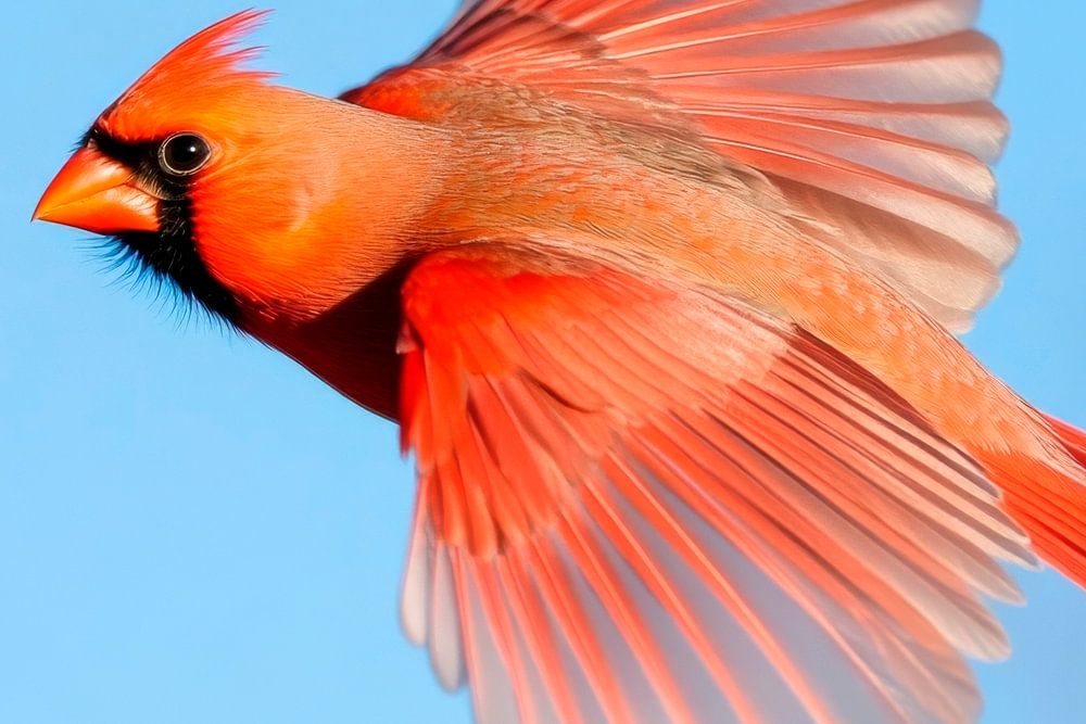 Inmitten des strahlend blauen Himmels schwebt ein lebhaft roter Vogel, dessen gefiederte Flügel wie leuchtende Farbtupfer im Sonnenlicht erstrahlen. Mit seinem auffälligen schwarzen Gesicht und dem eleganten Flug vermittelt er ein Gefühl von Freiheit und Anmut, während er die Luft durchschneidet und die Blicke aller auf sich zieht.