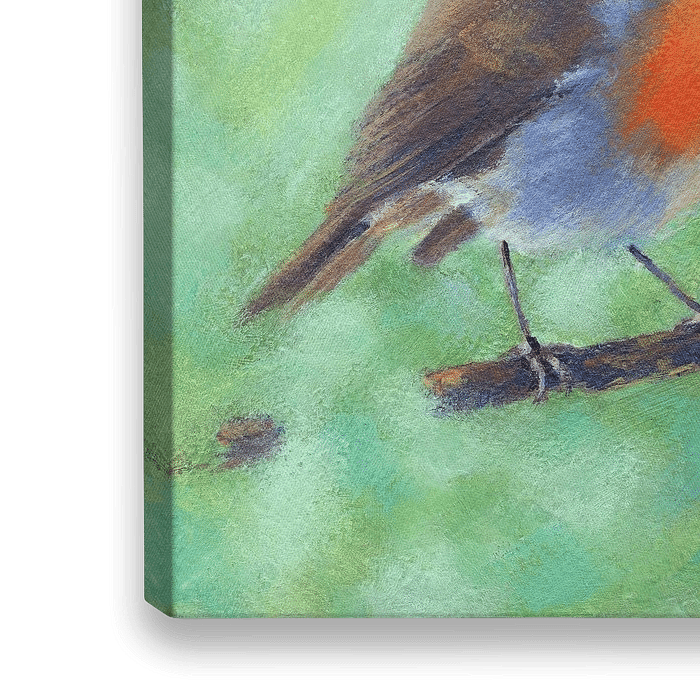 Rotkehlchen in den Wolken ist ein handgemaltes Acrylgemälde im quadratischen Format gemalt von der Künstlerin Karen Kaspar.