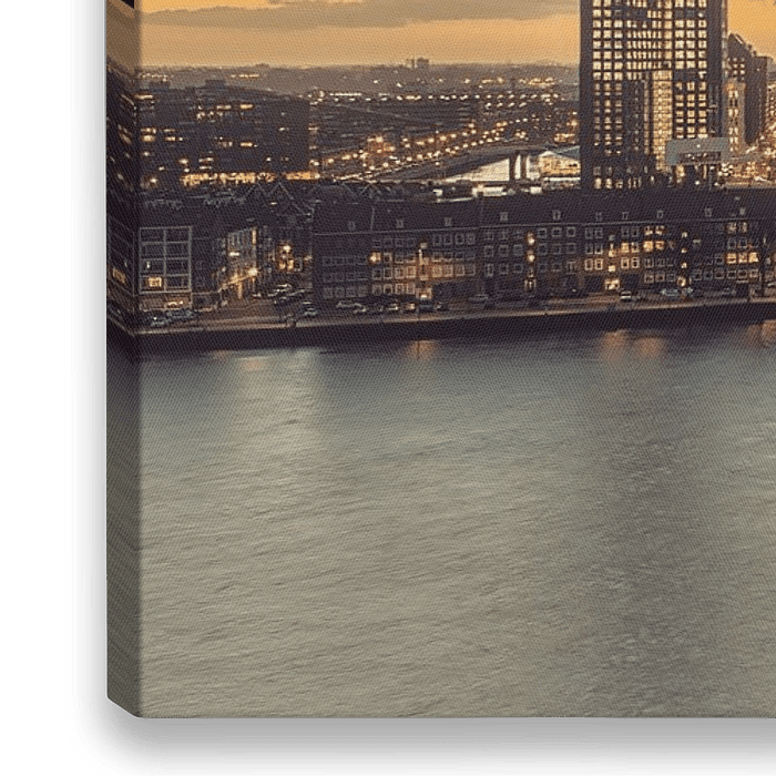 Rotterdam Skyline fotografiert von Hotel Inntel. 45 Meter über dem N.A.P. Foto wurde um 8.15 Uhr am Morgen eingenommen. Schöne gelbe und graue Töne mit dem Aufgang der Sonne.