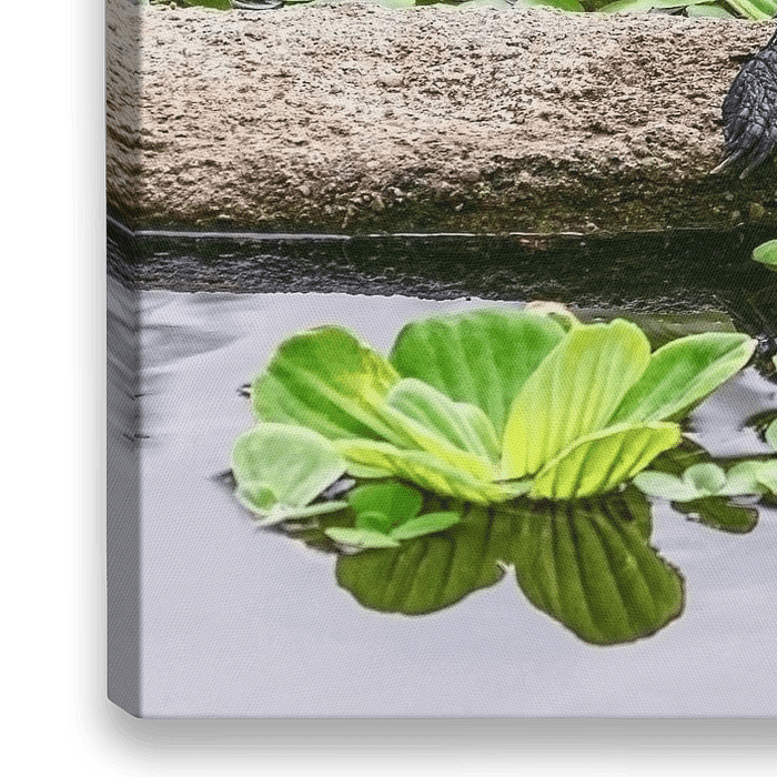 Bestelle das Foto Rotwangen-Schmuckschildkröte auf einem Baumstamm in einem Teich, der sich im Wasser spiegelt von Andreea Eva Herczegh als Reproduktion auf Leinwand, Alu-Dibond, als Poster, Fototapete oder Acrylglasbild.
