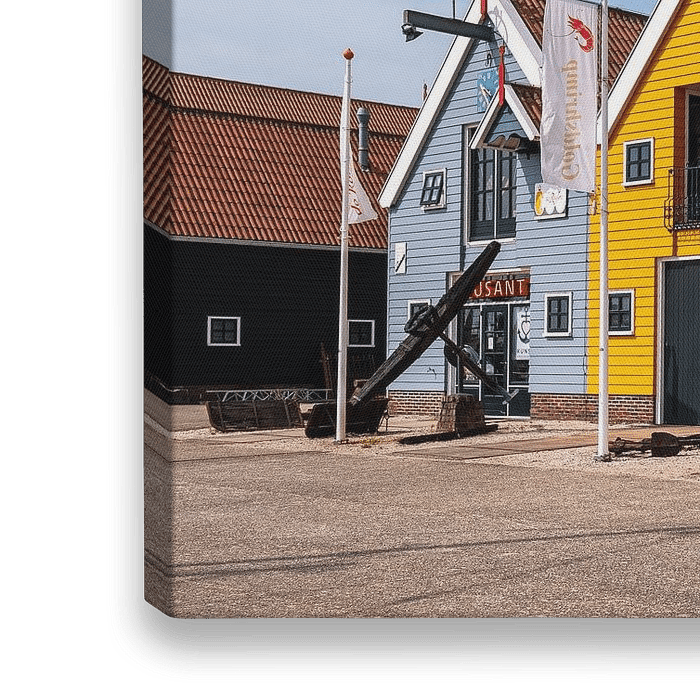 Skandinavisch inspirierte, farbenfrohe Holzhäuser an der Reitdiepskade im Hafen des Groninger Dorfes Zoutkamp. Dieses Foto wurde im Sommer 2021 aufgenommen.