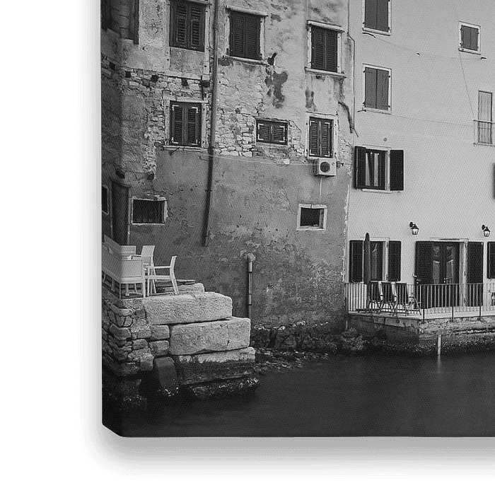 Ein Schwarz-Weiß-Foto von Rovinj, einer Stadt in Kroatien, die an der Nordsee, an der Westküste der Halbinsel Istrien liegt.