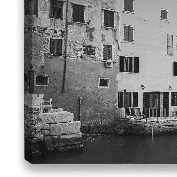 Ein Schwarz-Weiß-Foto von Rovinj, einer Stadt in Kroatien, die an der Nordsee, an der Westküste der Halbinsel Istrien liegt.