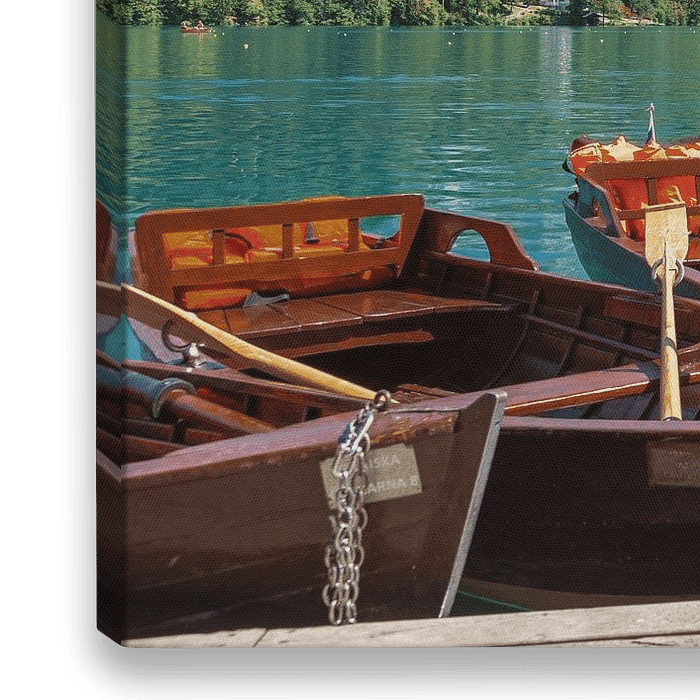 Ruderboote aus Holz am Bleder See in Slowenien mit Blick zur Burg von Bled
