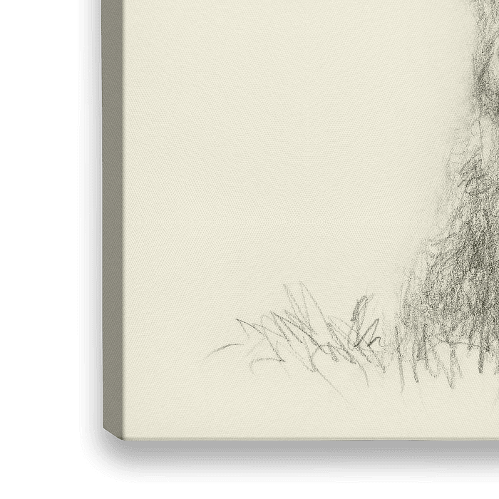 Ruhendes Hochlandrind ist eine detaillierte Bleistiftzeichnung, die ein zotteliges Hochlandrind mit markanten Hörnern und dem typischen langhaarigen Pony über den Augen zeigt, das auf einer Wiese ruht. Der Bulle ist entspannt und schaut ruhig nach vorne. Das Kunstwerk fängt die Textur des Kuhfells und den ruhigen Gesichtsausdruck mit feinen Bleistiftstrichen ein.