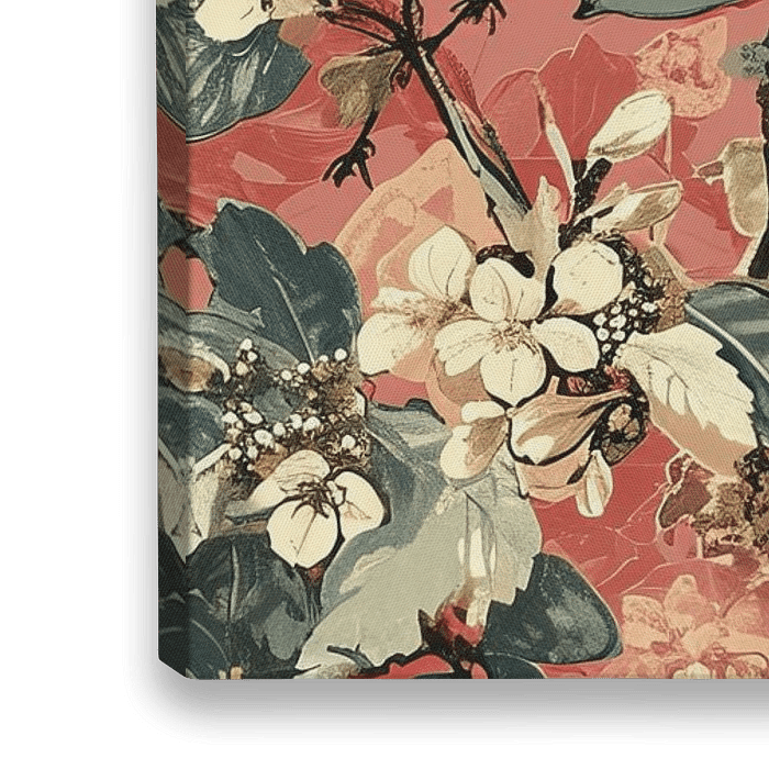 Tranquil Flora Elegance | Floral Painting - Mit einer lebendigen Komposition aus blühenden Zweigen vor einem rostfarbenen Hintergrund verkörpert dieses Gemälde ein Gefühl von organischer Eleganz. Die feine Textur der Blätter und Blüten in Kombination mit dem weichen, diffusen Hintergrund verleiht dem Bild ein romantisches und doch…