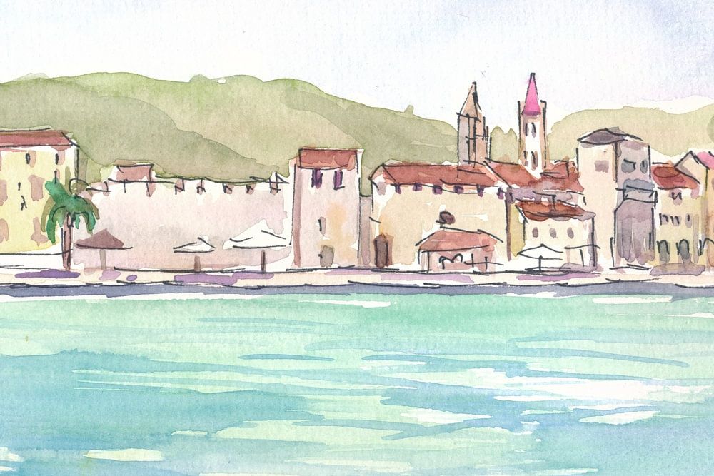 Ruhiger Blick auf das historische Trogir am Wasser, Kroatien