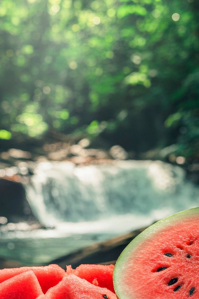 Frische, saftige Wassermelonen, perfekt in einer idyllischen Waldumgebung, erwecken sofort ein Gefühl von Sommer und Erneuerung. Die lebendigen Farben und das sanfte Licht verleihen dem Bild eine einladende Stimmung. Ideal für die Küche, schafft es eine fröhliche Atmosphäre und inspiriert zu gesunden Genussmomenten.