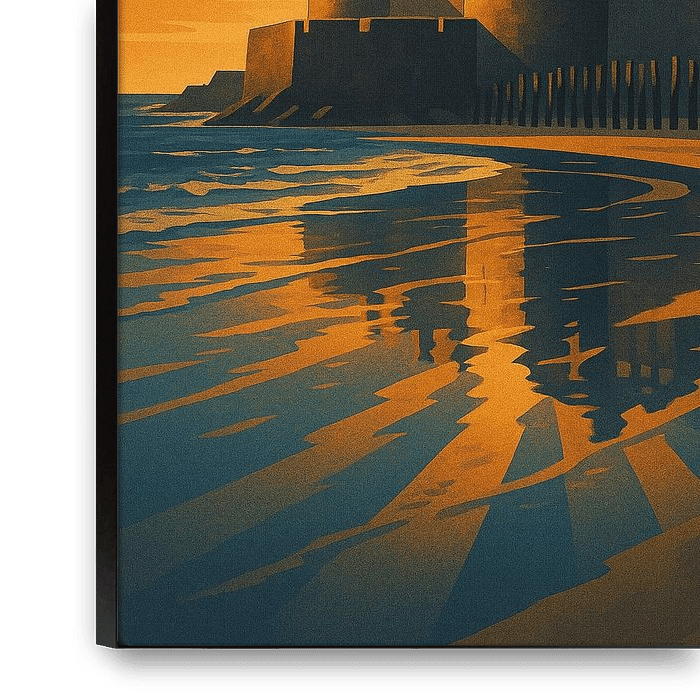 Dieses Art-Déco-Poster von Saint-Malo erinnert an die legendäre Stadt, deren Mauern sich bei Sonnenuntergang über den goldenen Gezeiten erheben. Mit warmen Bernsteintönen, die sich an der Küste spiegeln, und scharfen Lichtstrahlen, die die historischen Festungsanlagen beleuchten, verbindet dieses Kunstwerk Geschichte, Romantik und…
