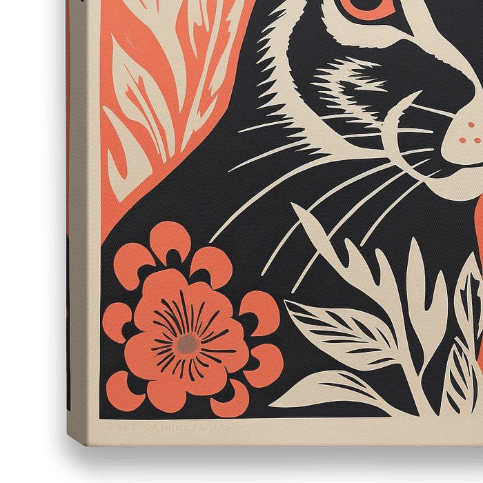 Velvet Rabbit - Dieses stilisierte Kunstwerk zeigt ein auffälliges Kaninchen, umgeben von Pflanzen in einem scharfen Kontrast aus Pfirsichflaum und Schwarztönen. Der Stil scheint vom Linolschnitt inspiriert zu sein, mit klaren, einfachen Linien, die ein verspieltes und modernes Gefühl vermitteln. Die Verwendung von negativem Raum…