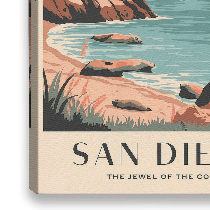 Die sanften Pastellfarben und die stilisierte Küstenlinie fangen die entspannte Atmosphäre San Diegos ein. Hohe Palmen wiegen sich im Wind, während das glitzernde Wasser den Horizont küsst. Ideal für das Wohnzimmer, schafft dieses Kunstwerk eine Oase der Ruhe und versprüht Urlaubsfeeling, das zum Träumen einlädt.