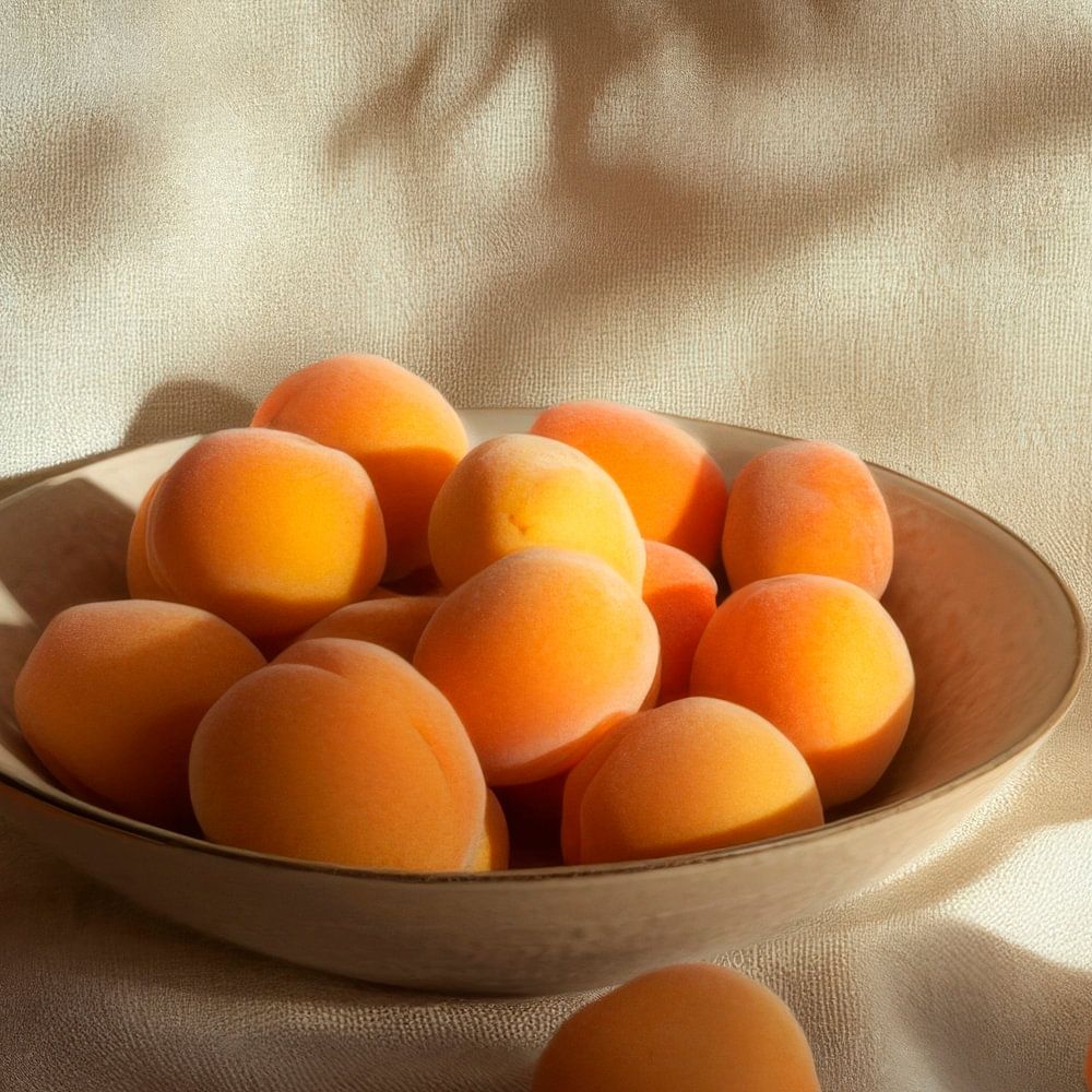 In sanften, goldenen Tönen leuchten die kleinen, runden Früchtchen in einer zarten Schale, während filigrane Schatten über die Stofflandschaft tanzen. Ein harmonisches Zusammenspiel von Licht und Textur schafft eine einladende Atmosphäre, die an warme Sommertage erinnert und die Sehnsucht nach Frische und Natürlichkeit weckt.
