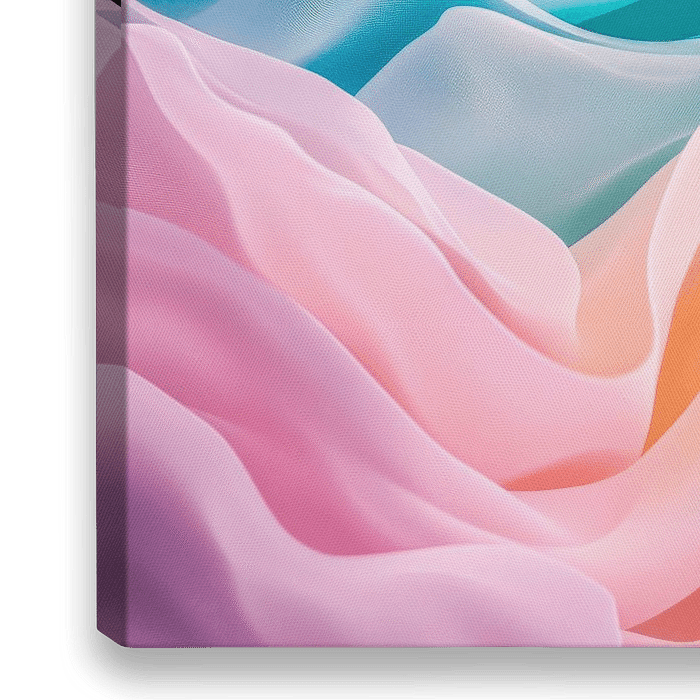 Zarte Wellen in sanften Pastellfarben fließen harmonisch ineinander und erzeugen ein Gefühl von Leichtigkeit und Eleganz. Die sanften Übergänge zwischen Mint, Rosé und Pfirsich laden zum Träumen ein. Dieses Kunstwerk eignet sich perfekt für ein Schlafzimmer, wo es eine beruhigende und entspannende Atmosphäre schafft.
