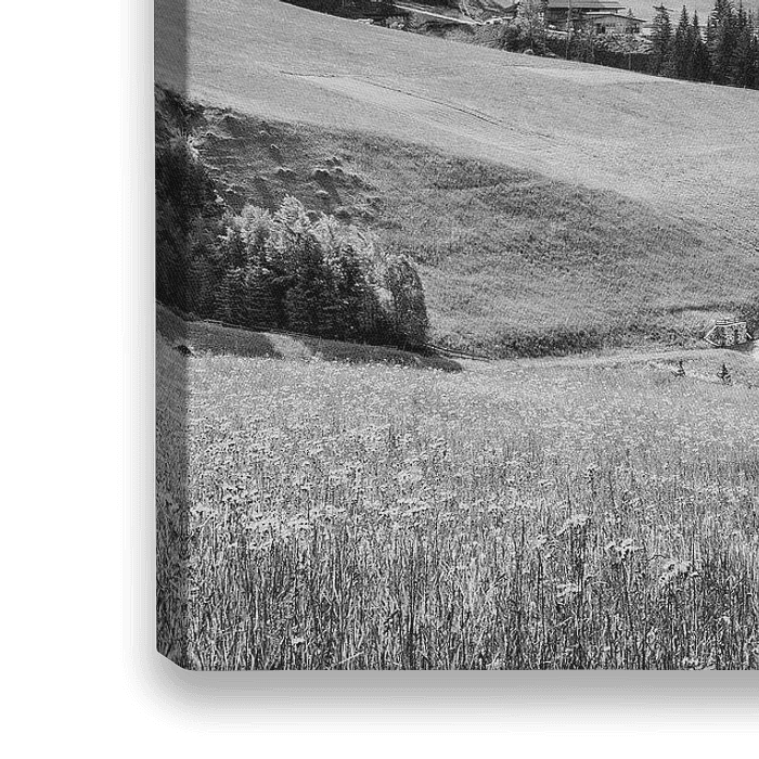 Ein Schwarz-Weiß-Foto von Santa Maddalena, auch bekannt als St. Magdalena, eine malerische mittelalterliche Kirche in den nördlichen Bergen Italiens. Die Geislergruppe der Dolomiten überragt das umliegende Tal und bietet eine unglaubliche Kulisse für die Fotografie.