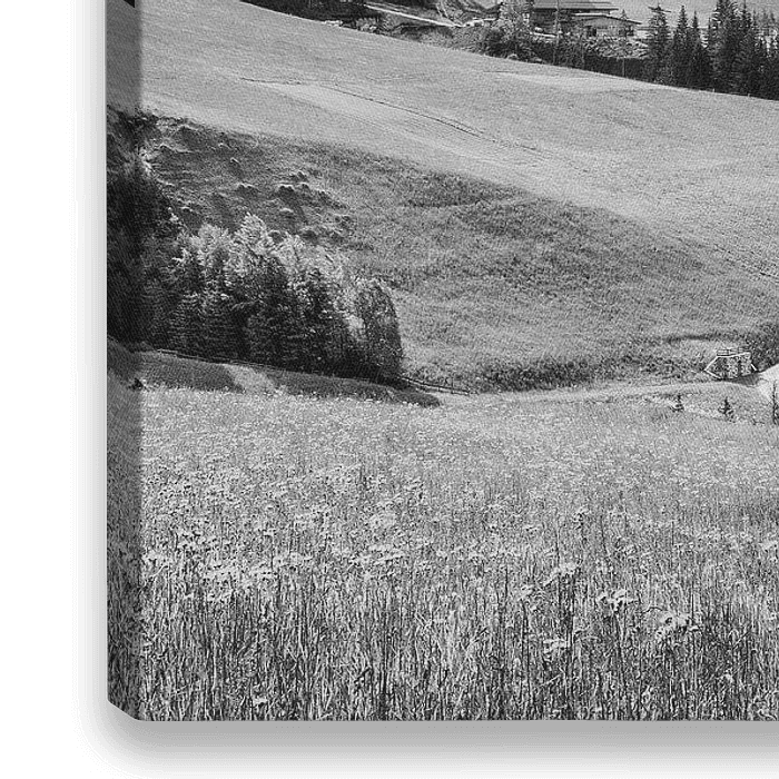 Ein Schwarz-Weiß-Foto von Santa Maddalena, auch bekannt als St. Magdalena, eine malerische mittelalterliche Kirche in den nördlichen Bergen Italiens. Die Geislergruppe der Dolomiten überragt das umliegende Tal und bietet eine unglaubliche Kulisse für die Fotografie.