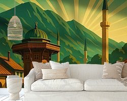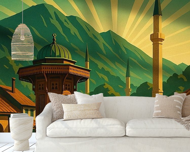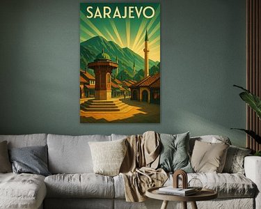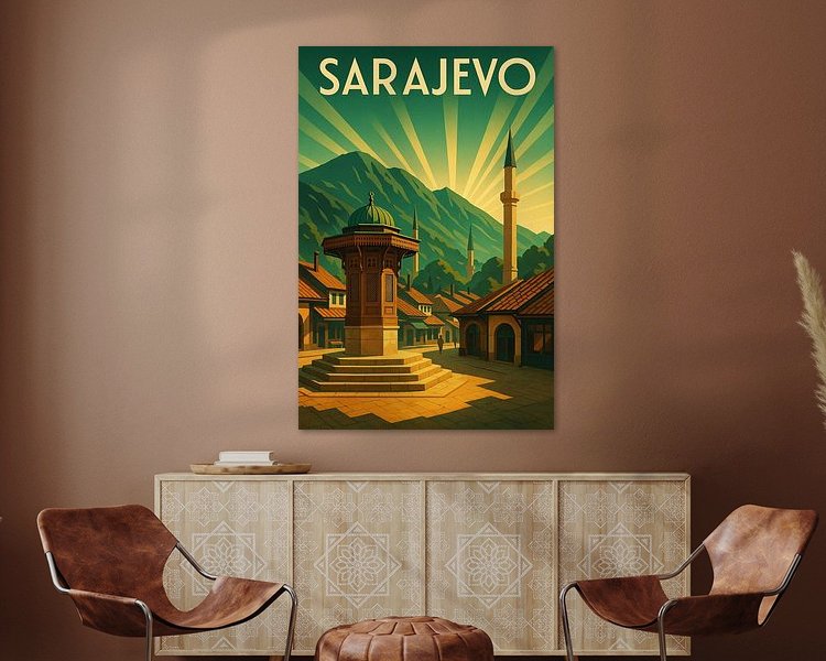 Feiern Sie den kulturellen Reichtum Sarajevos mit diesem Art-Déco-Reiseposter. Der Sebilj-Brunnen im Herzen von Baščaršija, umrahmt von traditionellen Dächern im osmanischen Stil und schlanken Minaretten, strahlt mit goldenen Strahlen, die über die Dinarischen Alpen fallen. Die geometrische Art-Déco-Behandlung unterstreicht Sarajevos einzigartige Rolle als Treffpunkt von Ost und West, wo osmanisches Erbe, österreichisch-ungarische Eleganz und modernes Stadtleben nebeneinander bestehen. Dieses Werk ist ideal für Liebhaber der Geschichte des Balkans, der islamischen Architektur und kultureller Kreuzungen. Die Komposition strahlt sowohl Lebendigkeit als auch Gelassenheit aus und fängt den Geist des alten Basars von Sarajevo ein - ein Ort der Märkte, Moscheen und Bergansichten. Ganz gleich, ob Sie Bosnien bereist haben oder davon träumen, es zu besuchen, dieses Poster ist eine zeitlose Erinnerung an eine Stadt, die Widerstandsfähigkeit, Schönheit und Vielfalt verkörpert. Eine atemberaubende Ergänzung für jede Sammlung von Reisekunst im Vintage-Stil.