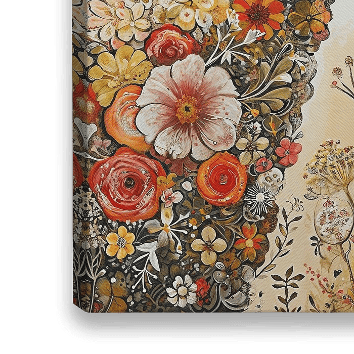 Schaf mit Blumen - Dieses lebendige Gemälde zeigt ein Schaf, das von einer Vielzahl üppiger Blumen und Pflanzen umgeben ist. Es ist in einem realistischen und doch leicht skurrilen Stil ausgeführt. Die Künstlerin hat eine warme Farbpalette mit hauptsächlich natürlichen Erdtönen verwendet, die mit Akzenten in Rot, Rosa und Orange…