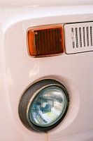 Bestelle das Foto Scheinwerfer eines rosa Retro-Hippie-Busses von Diana van Neck Photography als Reproduktion auf Leinwand, Alu-Dibond, als Poster, Fototapete oder Acrylglasbild.