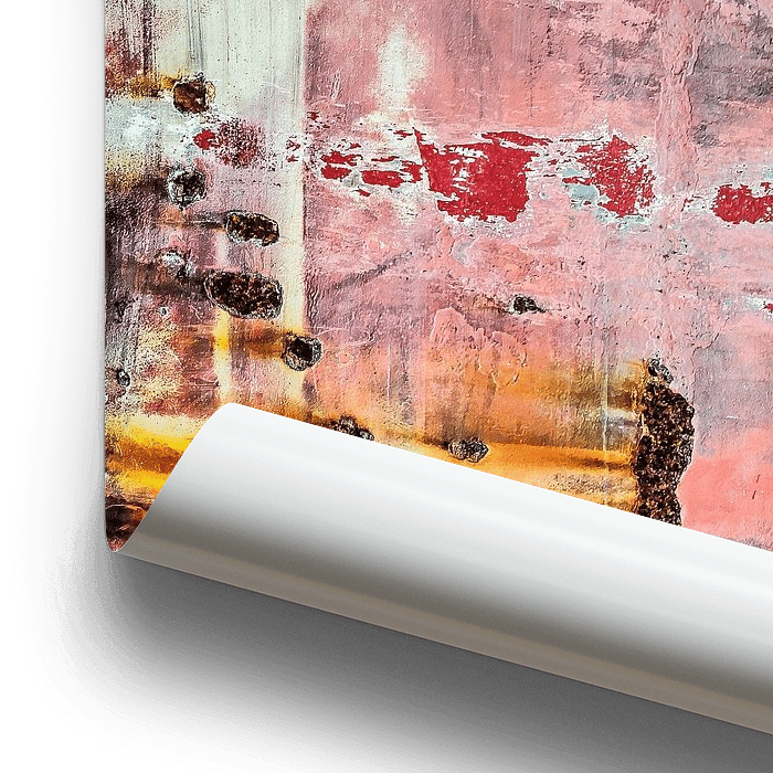 Ein abstraktes Gemälde, das von Menschenhand, aber vor allem durch den Einfluss von Wind und Wetter entstanden ist: ein Rumpf mit den Hauptfarben Rosa, Rot und Weiß und einigen Akzenten in Hellblau, Schwarz und Rostbraun.