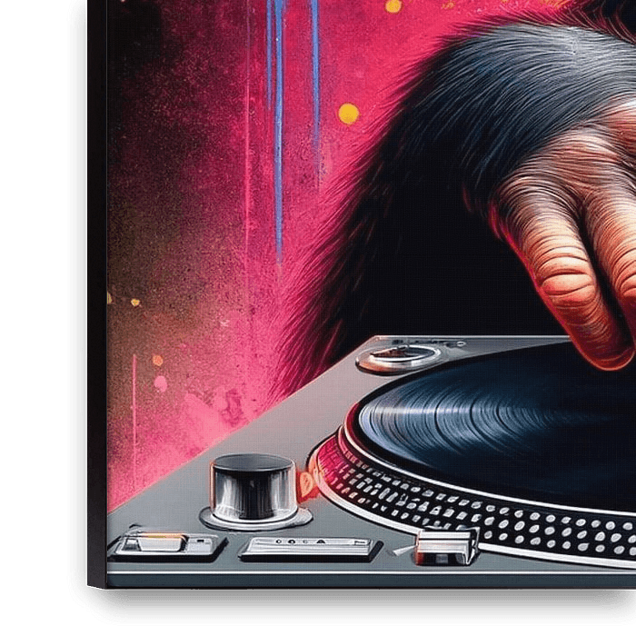 In dieser Darstellung wird ein Schimpanse als talentierter DJ inszeniert, der mit voller Hingabe an einem Plattenspieler steht. Sein Blick ist konzentriert, die Pranke behutsam auf der Vinylplatte, bereit, den perfekten Beat zu finden. Der Schimpanse trägt Kopfhörer und scheint in die Musik, die er spielt, tief eingetaucht zu sein.…