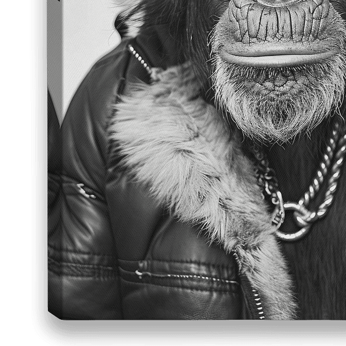 Ein monochromes Bild eines Schimpansen, der eine Sonnenbrille und eine modische Winterjacke trägt. Das Foto zeigt Detailreichtum und Charakter.