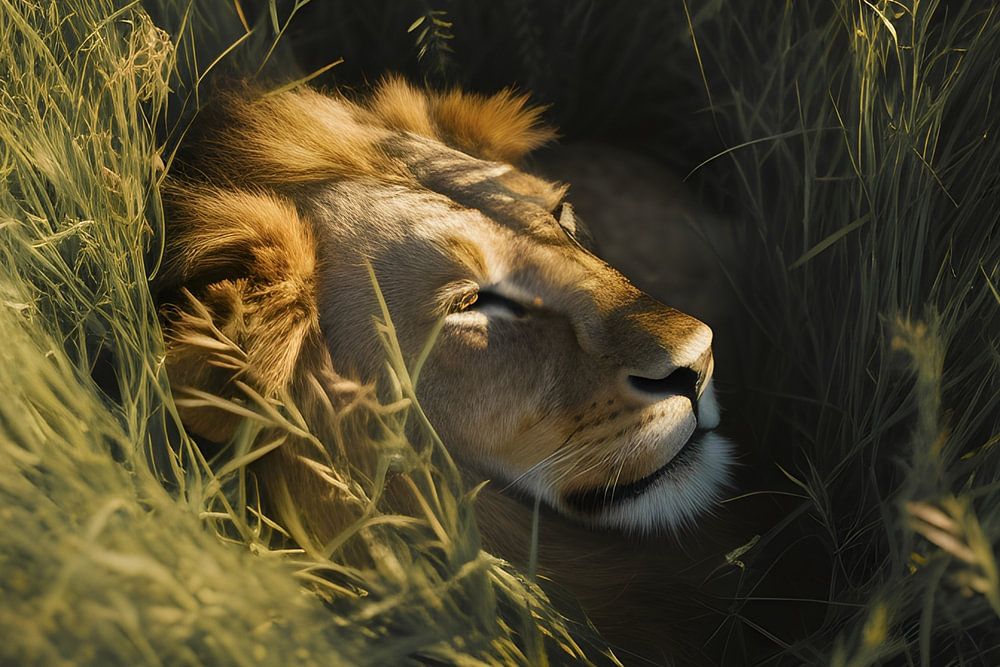 Zwischen dem hohen Gras in der Savanne liegt ein schlafender Löwe und genießt das letzte goldene Sonnenlicht.