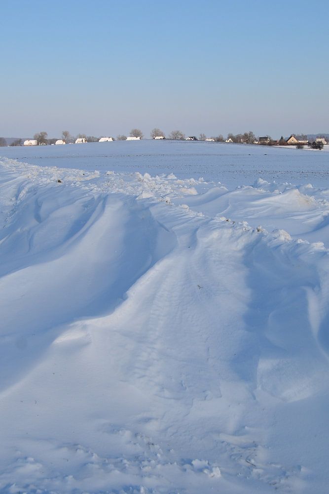 Schneeverwehungen bei Neukamp / Wreechen, Putbus, Insel Rügen, Mecklenburg Vorpommern, Deutschland